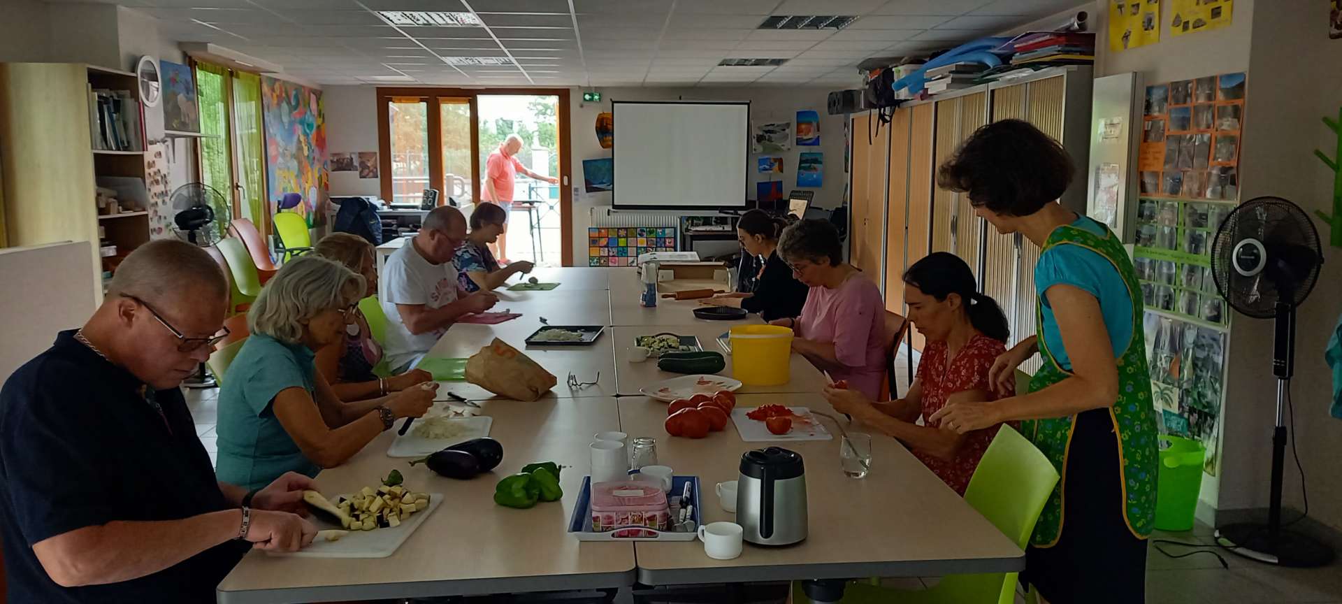 14 gourmands se sont réunis aujourd’hui autour d’une ratatouille maison préparée amoureusement avec des produits locaux achetés au marché d’Annecy dans la vieille ville.